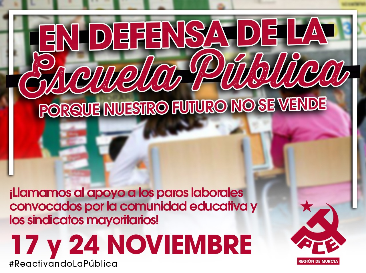 El próximo 17 y 24 de noviembre, la comunidad educativa está llamada a defender la Educación Pública. Los Sindicatos UGT, STERM y CCOO han convocado paros laborales por la bajada de ratios, la bajada de las horas lectivas, la mejora de las infraestructuras y el aumento de la Atención Educativa al alumnado con necesidades.